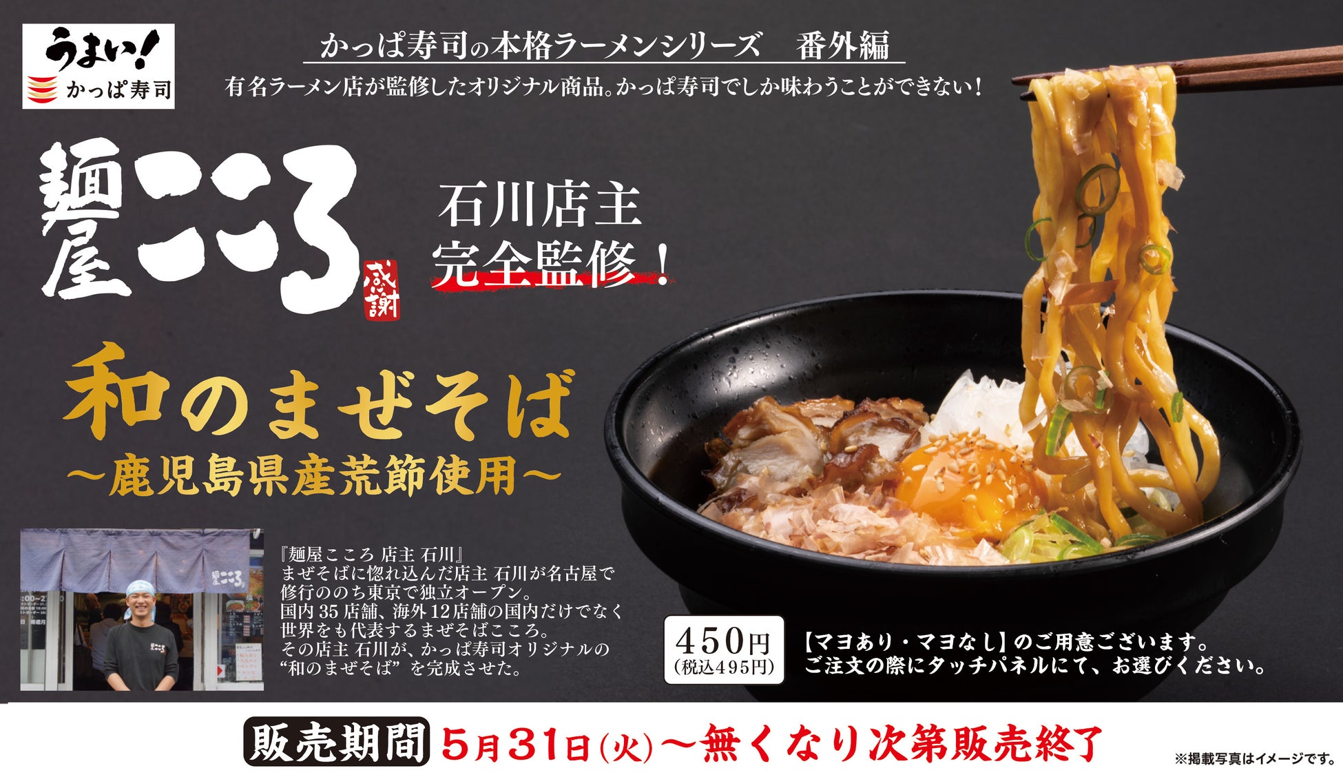 今回は再び番外編として、台湾まぜそばの人気店「麺屋こころ」の石川店主完全監修、鹿児島県産の荒節を使用した、かっぱ寿司でしか食べられない“和”にこだわったオリジナルの「まぜそば」が登場します。