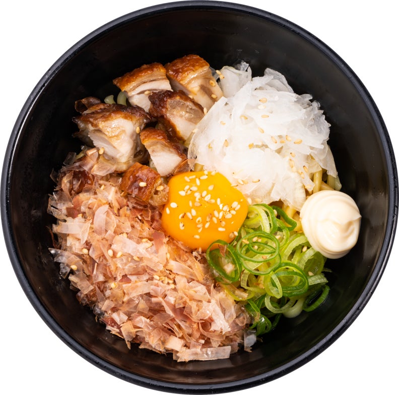 味の決め手となる「荒節」は、鰹節の生産業が始まって300年以上、国産生産量70%を超える鹿児島県の風味豊かな鰹節を使用。パリパリに揚げた香ばしいチキンにシャキシャキの玉ねぎ、さらに卵黄ソースと青ネギ、ごまをトッピング。お手元に届きましたら、しっかりタレと麺、トッピングを混ぜてお召し上がりください!さらに、麺を完食したら相性抜群の「本気シャリ」を入れ、具材とタレを余すことなく最後の一口までお楽しみください。また、今回はお好みに合わせてマヨネーズ有りと無しがお選びいただけます。