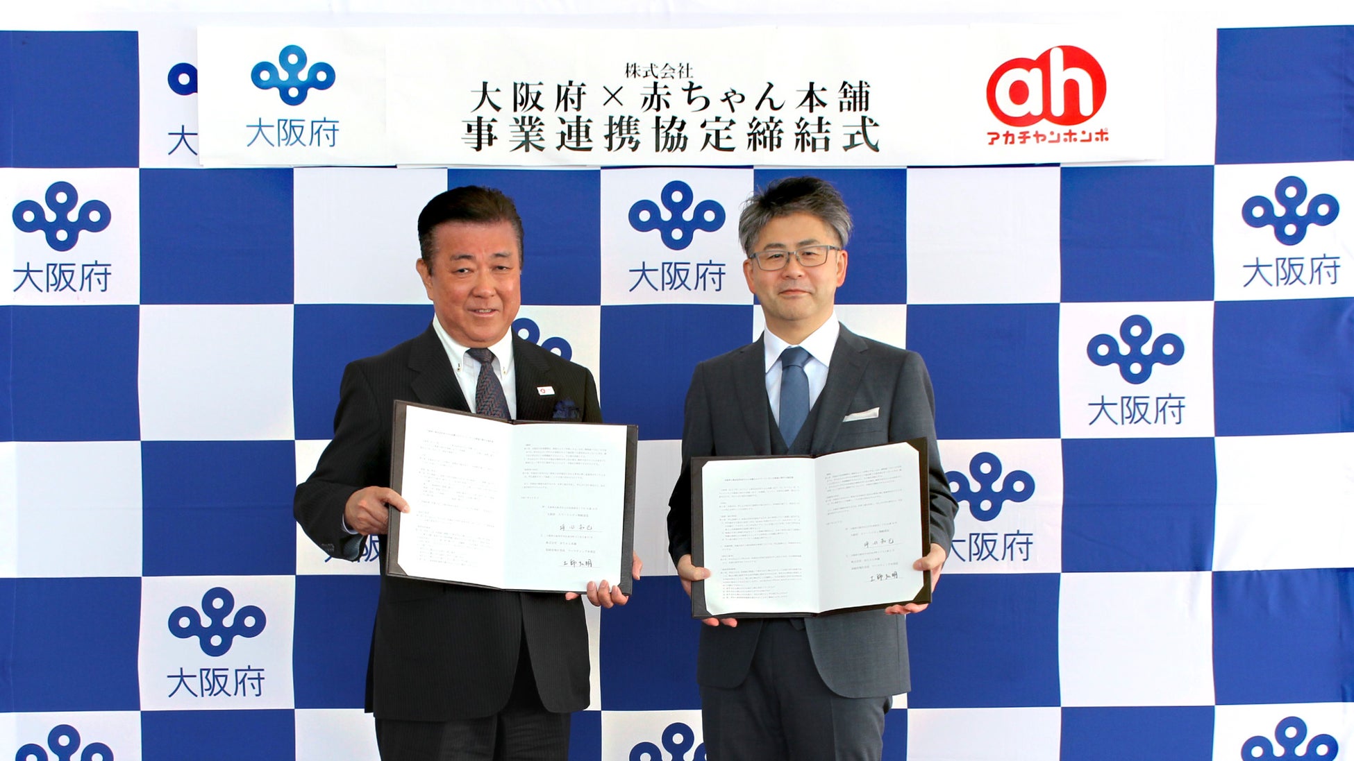株式会社赤ちゃん本舗(本社:大阪市中央区 https://www.akachan.jp)は、大阪府と「子育て×スマートシティ」の推進に向けた取り組みを相互に連携・協力していくため事業連携協定(以下、本協定)を2025年2月27日(木)に締結し、協定締結式を行いましたのでお知らせいたします。