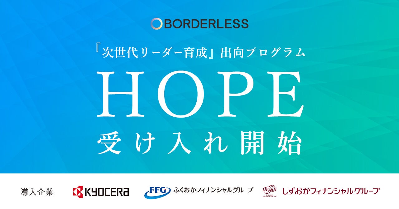 株式会社ボーダレス・ジャパン(所在地:福岡県福岡市、代表取締役:田口一成、以下:ボーダレス)は、2024年4月より次世代リーダー育成出向プログラム「HOPE」を導入した京セラ株式会社(所在地:京都府京都市、代表取締役社長:谷本 秀夫)、株式会社ふくおかフィナンシャルグループ(所在地:福岡県福岡市、代表取締役 五島 久)、株式会社しずおかフィナンシャルグループ(所在地:静岡県静岡市、代表取締役社長:柴田 久)の未来を担う次世代リーダーの受け入れを開始したことをお知らせします。受け入れ期間は1年間を予定しており、新規事業開発を通した人材育成にコミットしてまいります。