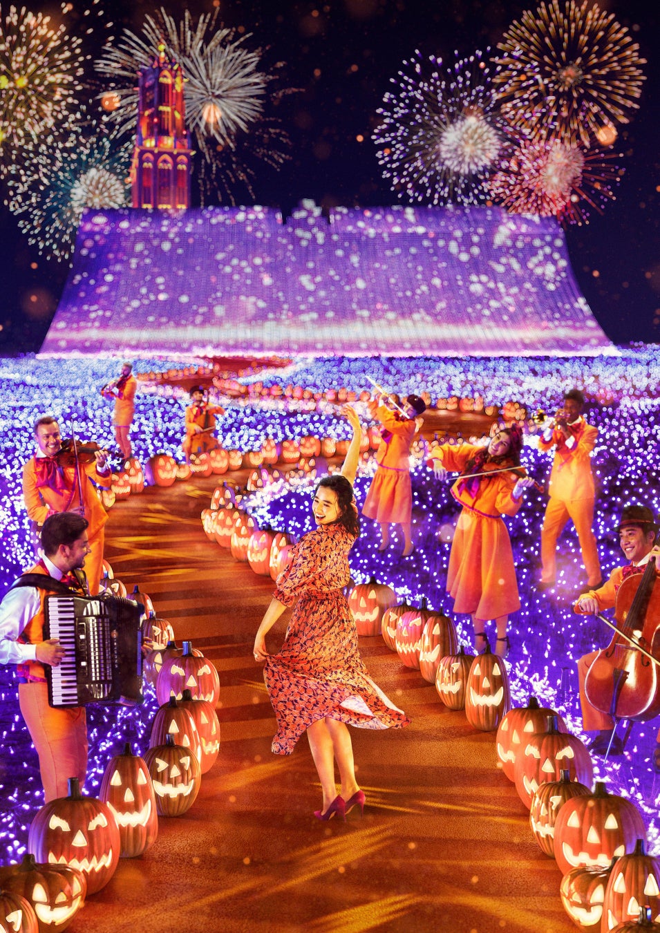 イルミネーションだけではなく、ハロウィーンカラーのコスチュームに身を包んだ音楽隊による優雅なナイトコンサートも。見ても聴いても楽しめる新しいイルミネーションをお届けいたします。