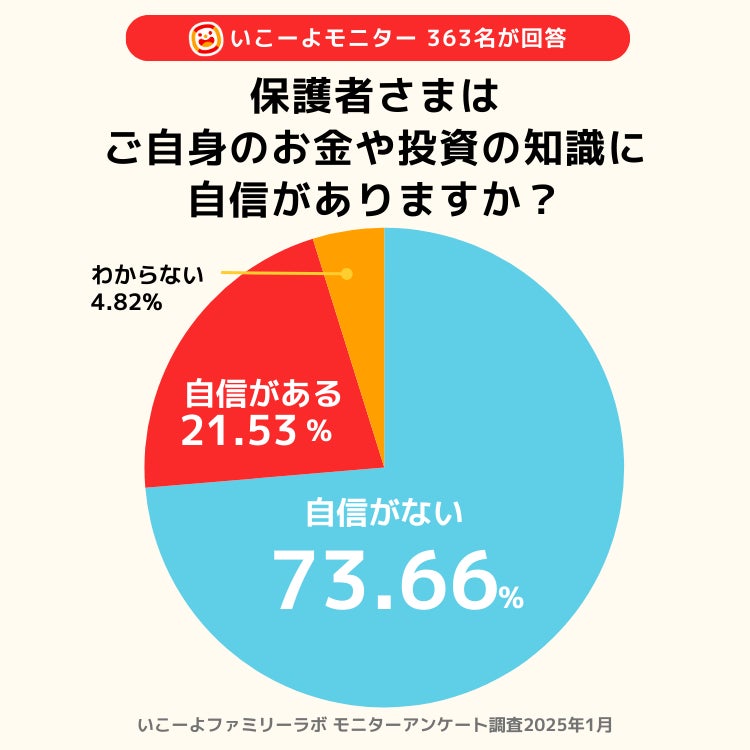 しかし、現状では73.66%の保護者が「お金や投資の知識に自信がない」と回答しており、家庭での金融教育を進めるには、親自身の学びも必要不可欠であることがわかります。