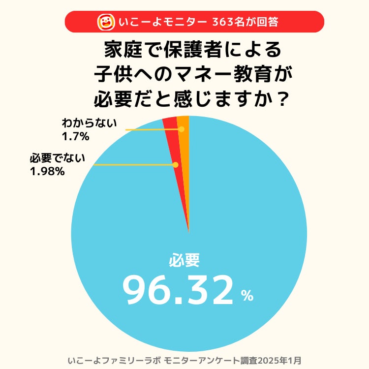 保護者による家庭での「マネー教育」の必要性には、96.32%の保護者が「家庭での金融教育が必要」と回答し、「必要ない」と答えたのはわずか1.98%でした。