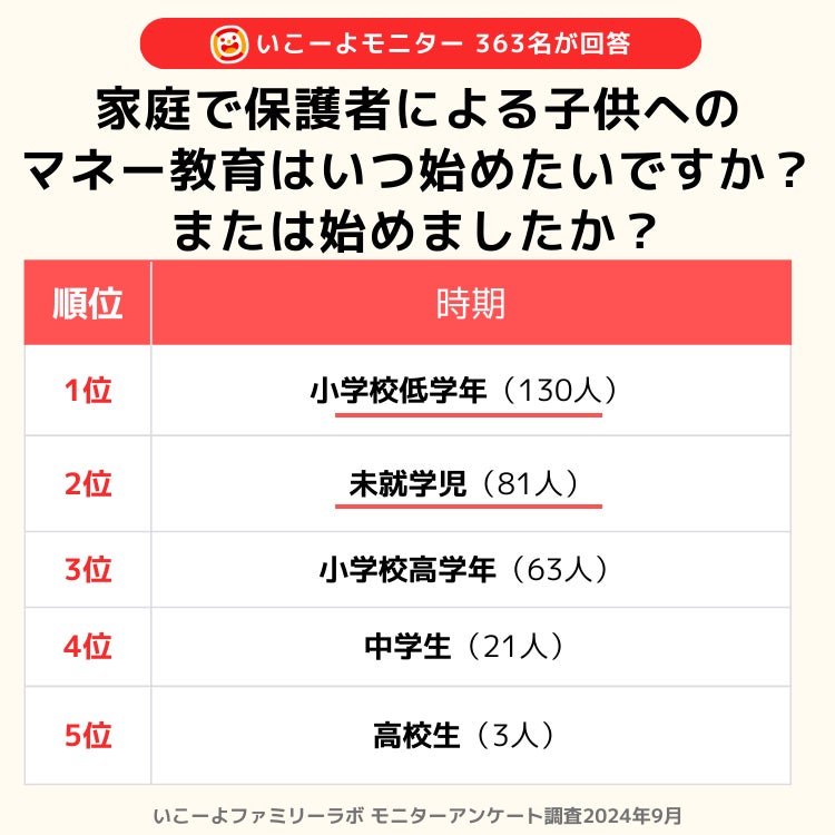 一方で、4位「中学生」(21人)、5位「高校生」(3人)となり、早期の金融教育を重視する保護者の傾向が見られます。