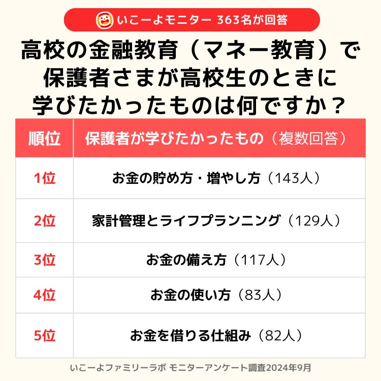 続いて2位 は「家計管理とライフプランニング」(129人)、3位は「お金の備え方」(117人) となり、将来に向けた資産形成や計画的なお金の管理に関する知識を高校時代に学んでおきたかったと考えている保護者の姿が浮き彫りになっています。