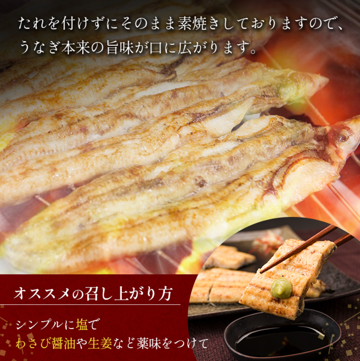 白焼きでしか味わえない鼻から抜ける香ばしさ、皮目のパリッとした食感など、蒲焼きとはまた違う自慢の味わいです。塩とわさび、梅肉など、“通”な食べ方が楽しめるのでグルメなギフトにいかがでしょうか。