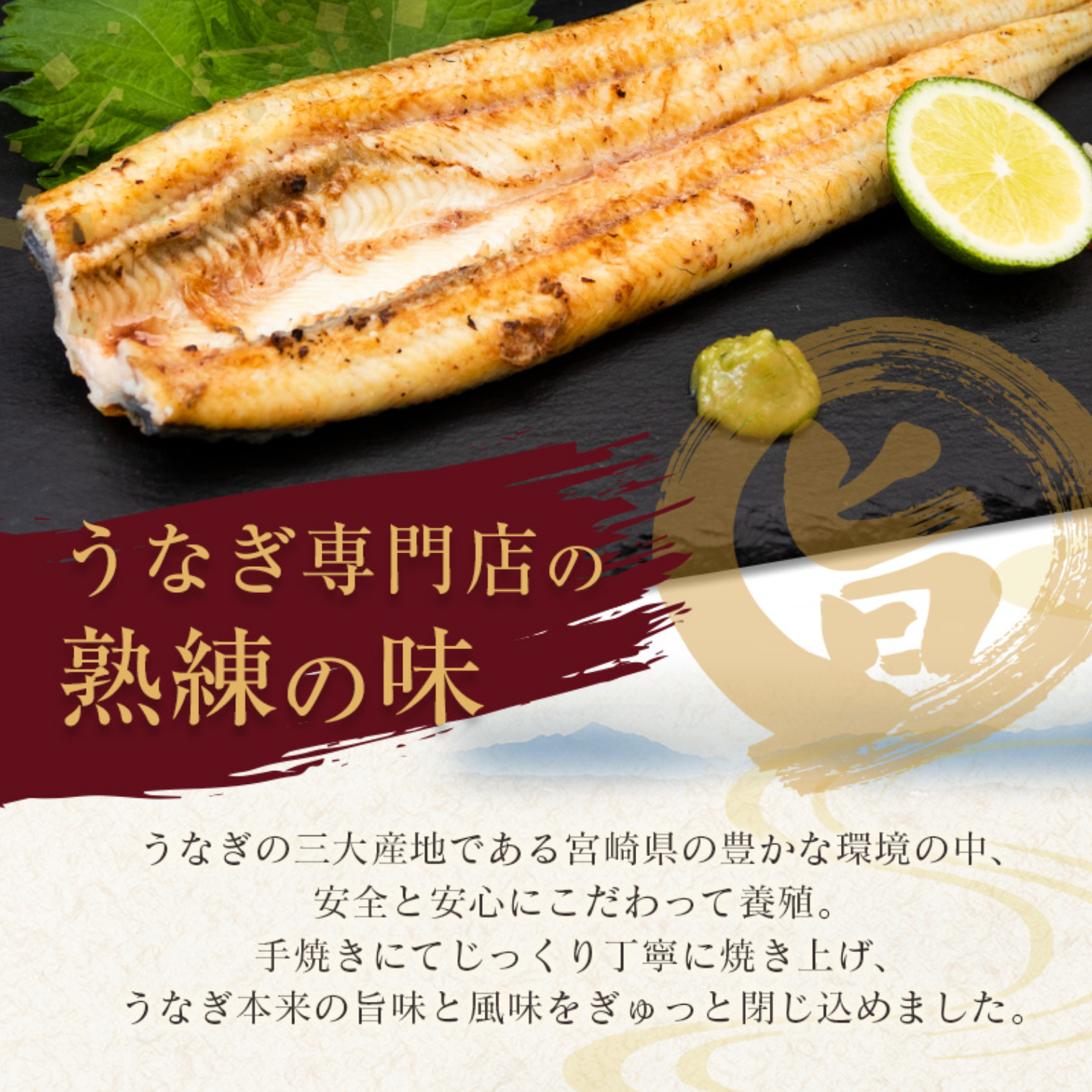 中でも新富町の町沿いに流れる一ツ瀬川は、天然うなぎが遡上してくるほどうなぎ好みの水質をしています。川の周辺には地下水が豊富に湧くため、その水を使い、自然に近い環境でうなぎを育てられる新富町は、宮崎県の中でも昔から養鰻の名地として知られています。手焼きにてじっくり丁寧に焼き上げ、うなぎ本来の旨味と風味をぎゅっと閉じめた「うなぎの白焼き」をご賞味ください。