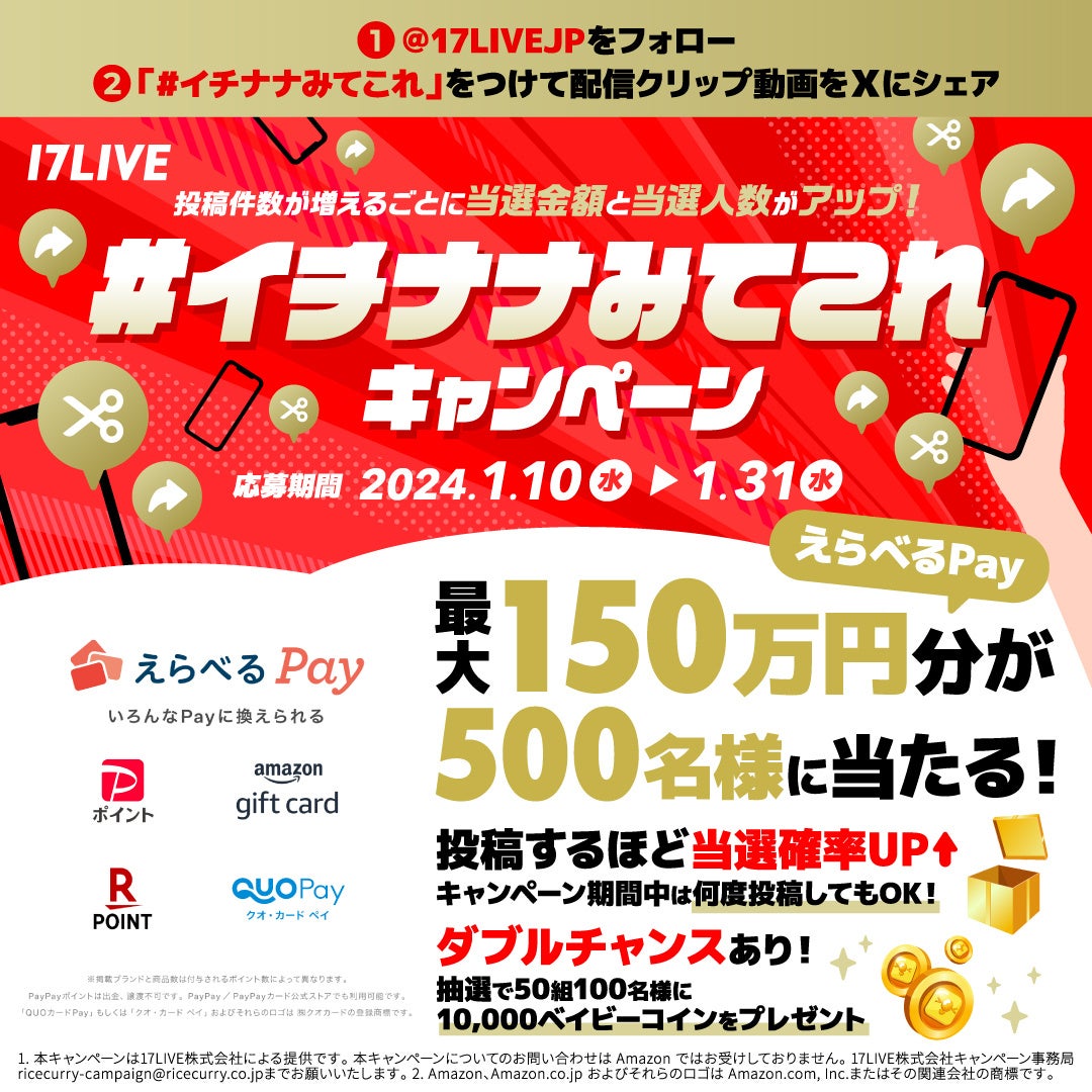 本キャンペーンは、「配信クリップ機能」を利用してアプリ内でシェアした動画の中から再生回数上位の方に、総額100万円分の“えらべるPay”をプレゼントする「配信クリップ動画選手権」と、「配信クリップ機能」で作成した動画をX(旧Twitter)にて指定のハッシュタグをつけてシェアいただいた方の中から抽選で、最大で総額150万円分の“えらべるPay”をプレゼントする「#イチナナみてこれ キャンペーン」の同時開催となります。いずれのキャンペーンも、期間中何度でも参加することが可能で、投稿する回数やクリップする回数が増えると当選確率がアップする仕様となっています。