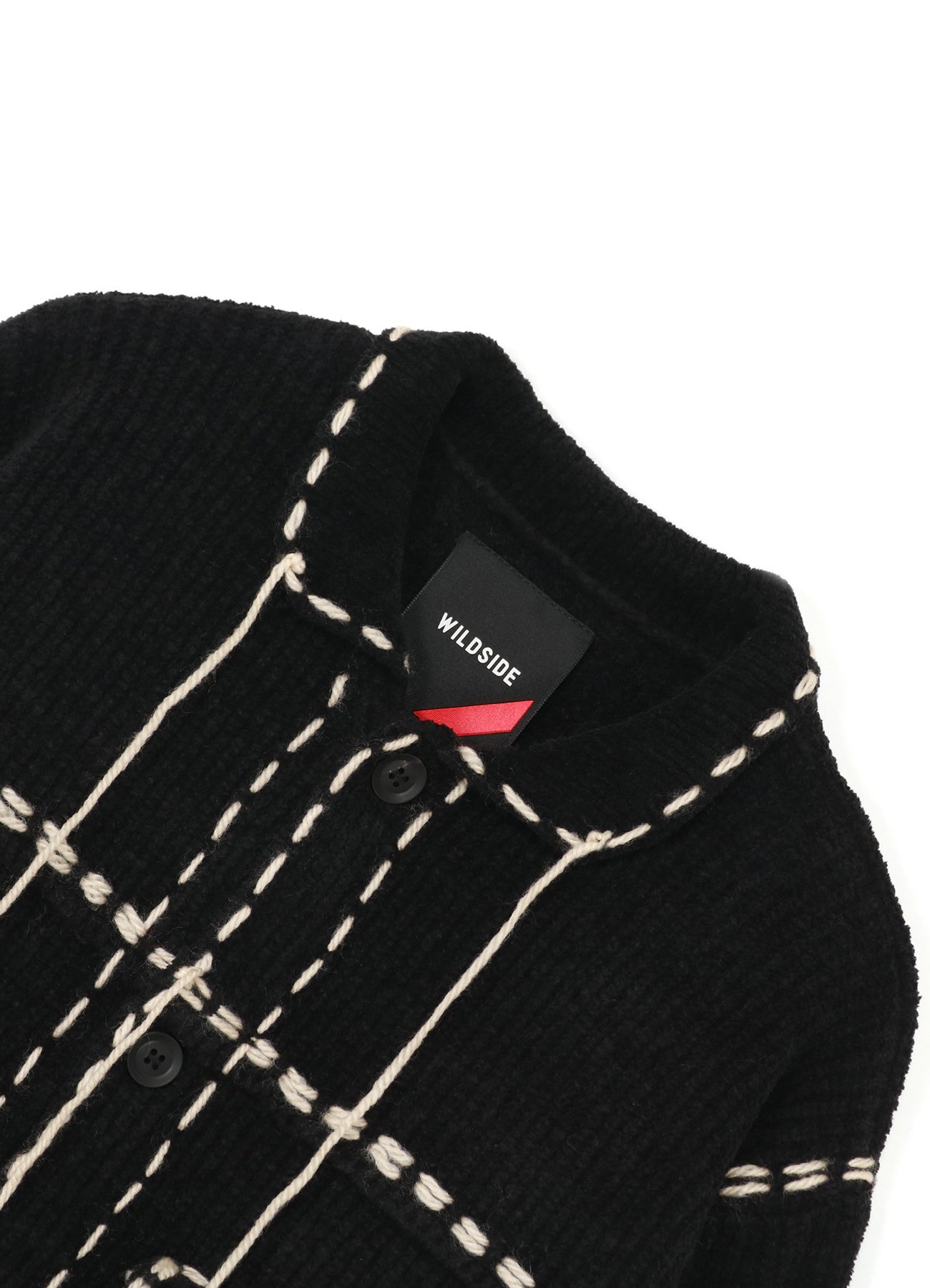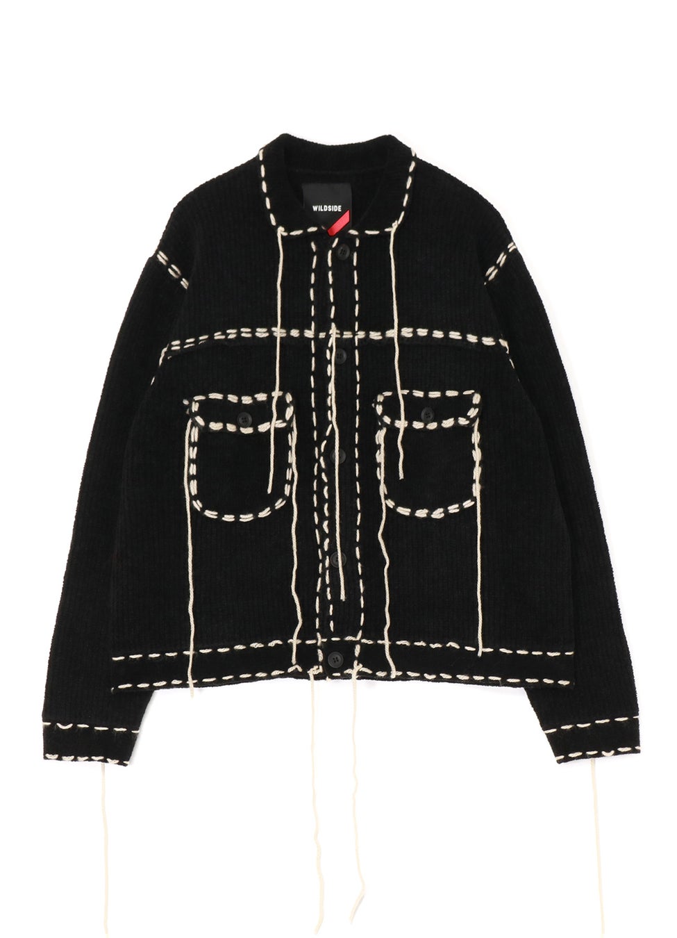 本コラボレーションでは、<PHINGERIN>シグネチャーアイテムである手編みのニットカーディガンをWILDSIDE仕様にアップデートしました。生成りと赤のステッチ糸の端を様々な箇所から垂らしたユニークなディテールは、切ったり結んだりと自由にアレンジし、自分の好きなバランスを作ることができるデザインとなっています。