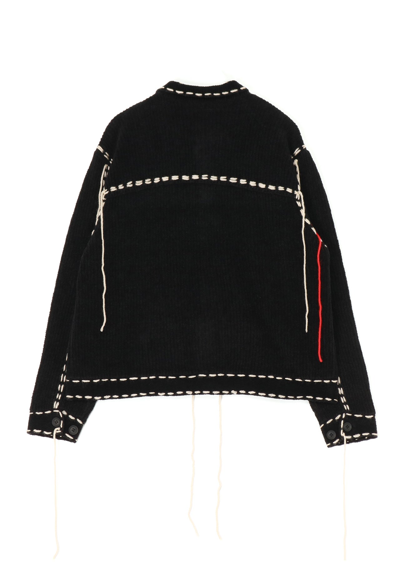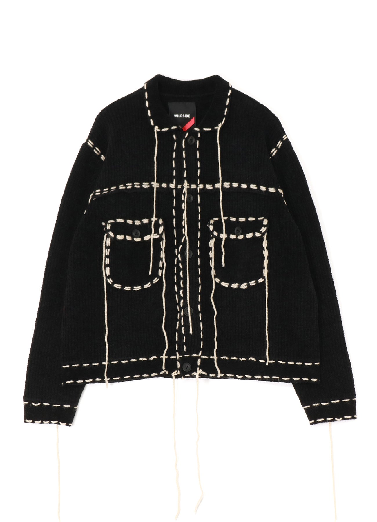 各所からステッチ糸を垂らしたデザインの手編みニットカーディガン