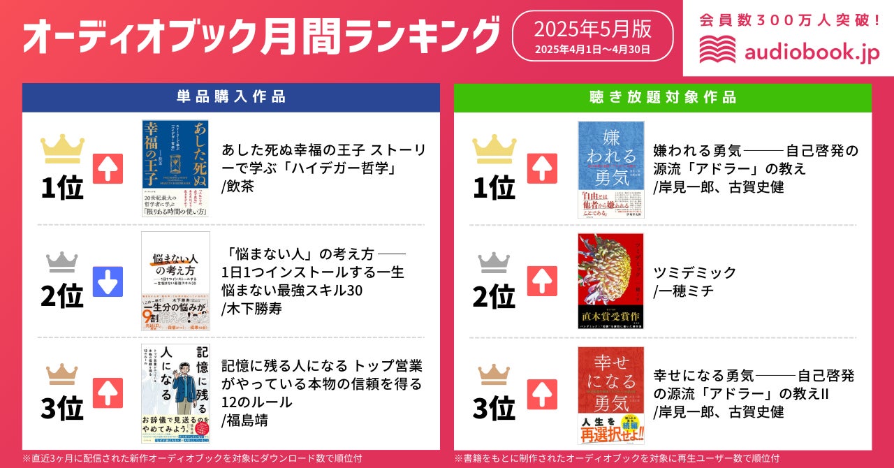 「audiobook.jp」のオーディオブック作品(※2)のダウンロード数または再生ユニークユーザー数をもとに順位付けした、5月付(2025/4/1~4/30)の「単品購入作品(※3)」と「聴き放題対象作品」におけるランキング トップ10を発表します。