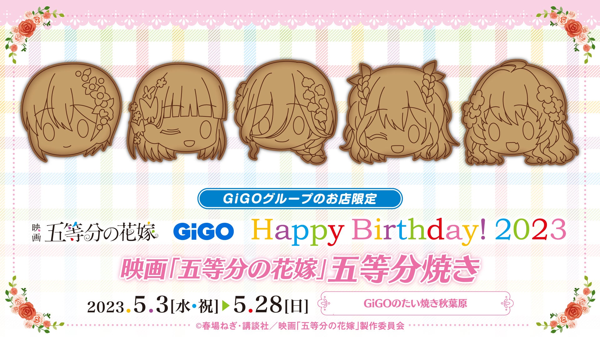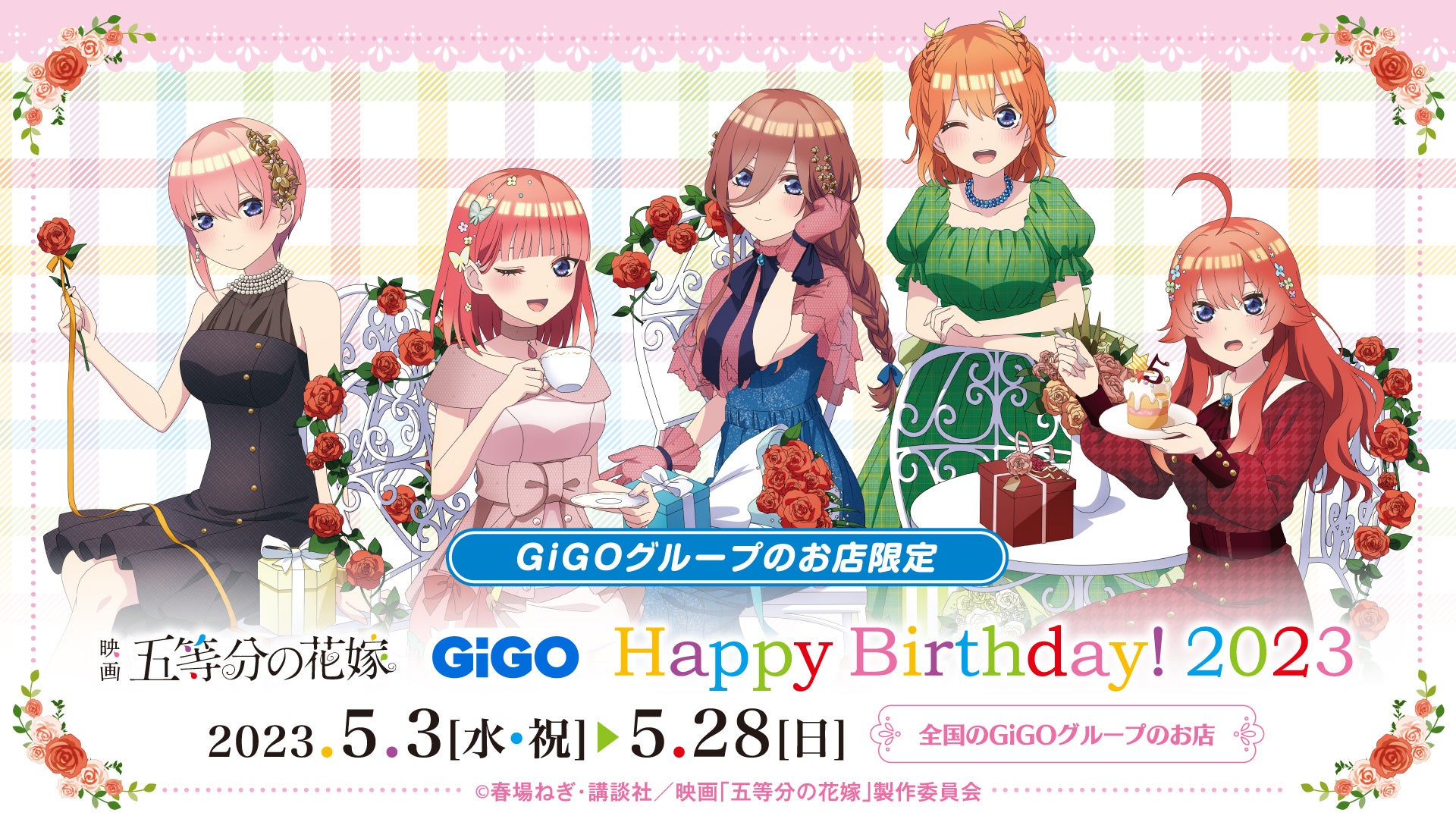 は、GiGOグループのお店におきまして「週刊少年マガジン」で連載された春場ねぎによる大人気コミック「五等分の花嫁」とコラボレーションした、『映画「五等分の花嫁」GiGOプライズキャンペーン Happy Birthday! 2023』を2023年5月3日から開催いたします。