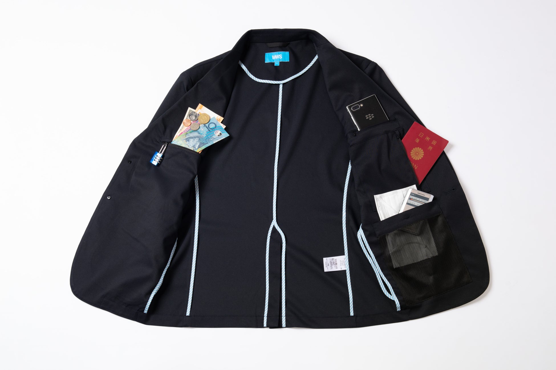 国際協力に携わるプロたちの多くは一年の半分以上を海外の現場で過ごしています。手荷物を放棄して避難しなければいけない緊急事態に備えて、長期間滞在でも必要最低限の荷物に抑える必要があり、必然的に洋服の数も制限されます。そんな中で、毎日洗えて、シワになりにくく、速乾で着心地の良いWWSを着用している社員がおり、国際協力人に特化したスーツがあれば業界もより盛り上がるのでないかと考えました。制作での一番のこだわりは安全面。海外の保安検査で貴重品がなぜか紛失することは、度々報道されているため、パスポート専用ポケットや、複数のファスナー付きポケットをつけることで、セキュリティに配慮したデザインを提案しました。