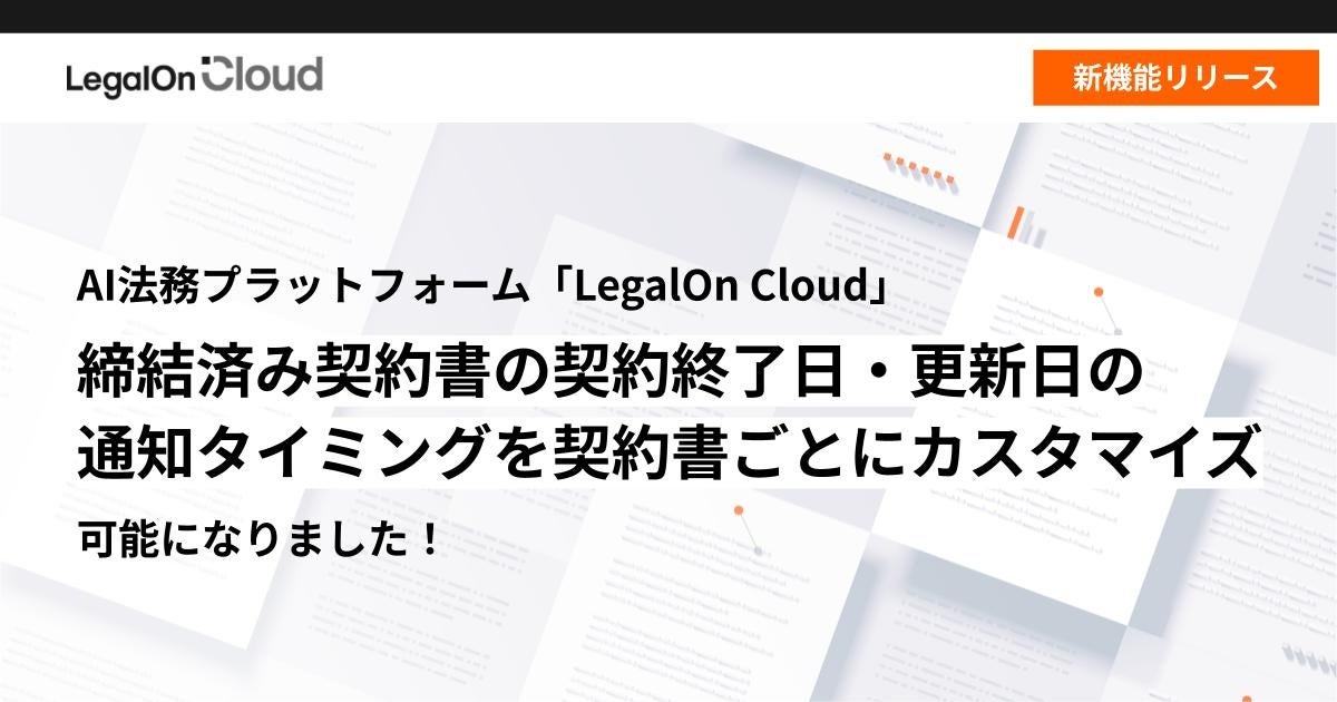 株式会社LegalOn Technologies(本社:東京都渋谷区 代表取締役 執行役員・CEO:角田 望)が提供する、法務業務全体を包括的に支援するAI法務プラットフォーム「LegalOn Cloud」( https://www.legalon-cloud.com/ )で、締結済み契約書の契約終了日や更新日の通知タイミングを契約書ごとにカスタマイズできるようになりました。