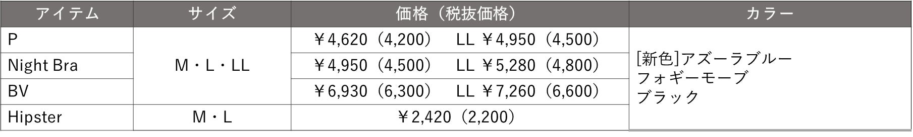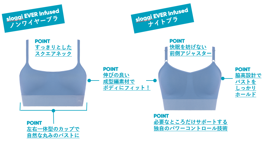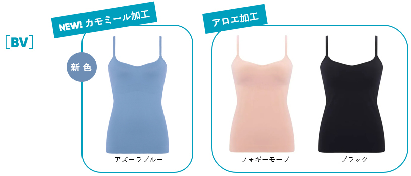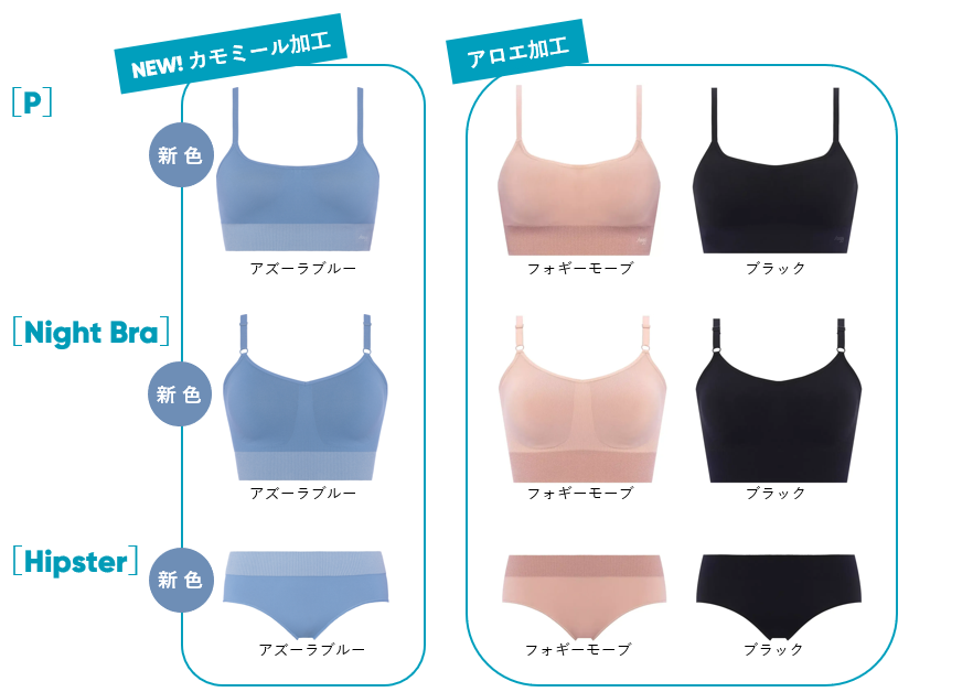 アイテムは、気軽なノンワイヤーや前側アジャスターで寝ている間の当たりも気になりにくい人気のナイトブラなどトップが3型と、定番ショーツの4アイテムを展開。
