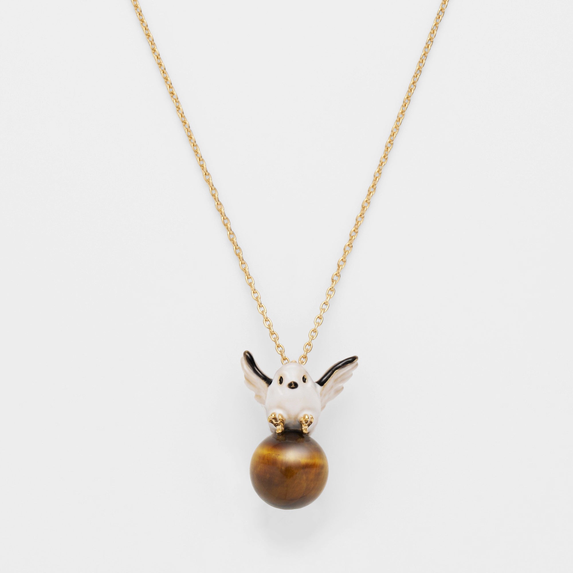 木の枝から颯爽と飛び立つ1羽のシマエナガ。冬の森の中で暮らす、シマエナガの一瞬の動きをネックレスに。