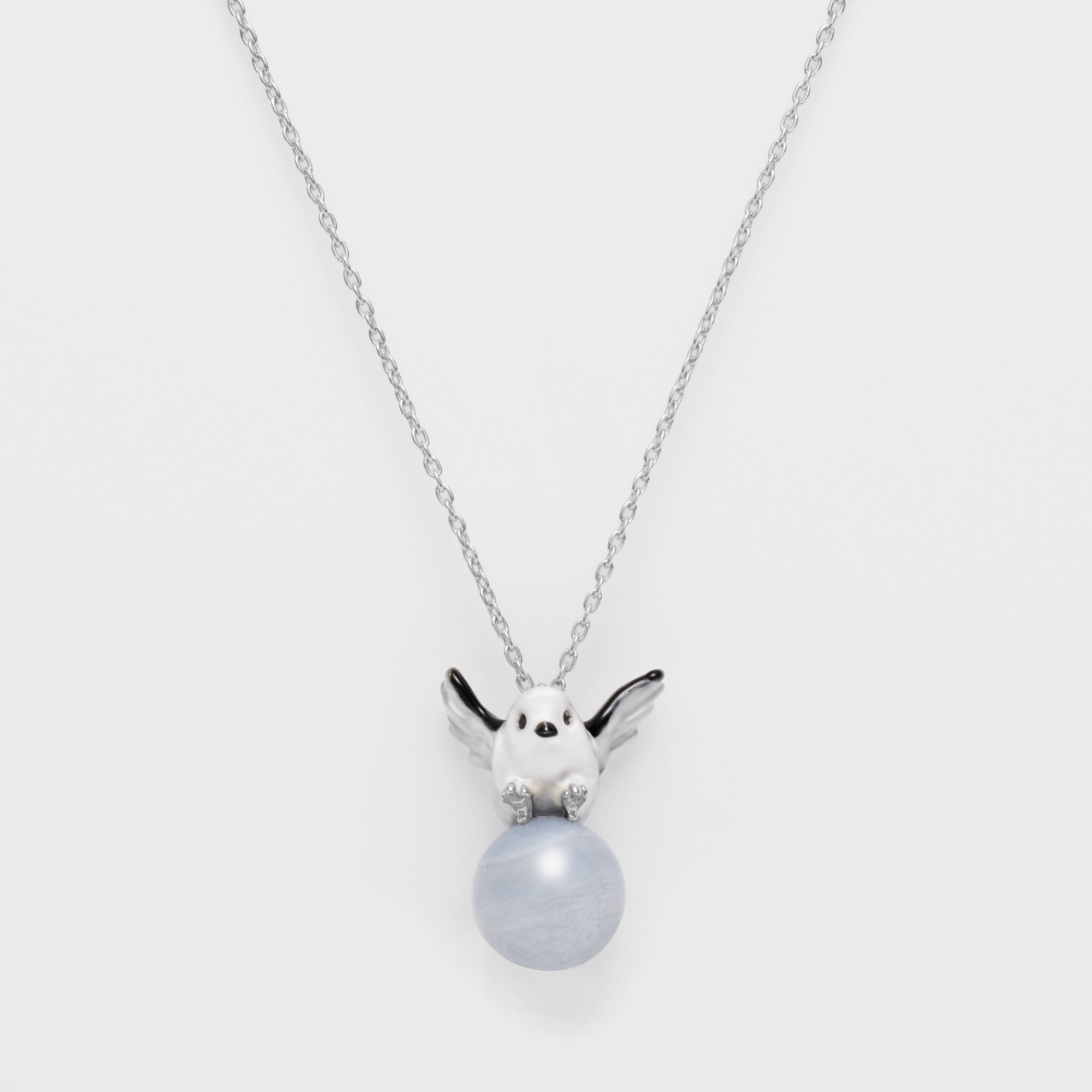 ブルーレースアゲートは優しい空色を持つことから「深い癒し」の力があると言われています。木に見立てたタイガーアイには「金運」や「仕事運」アップの石言葉があります。 胸元の愛らしいシマエナガが、心に癒しと幸運を運んで来ます。