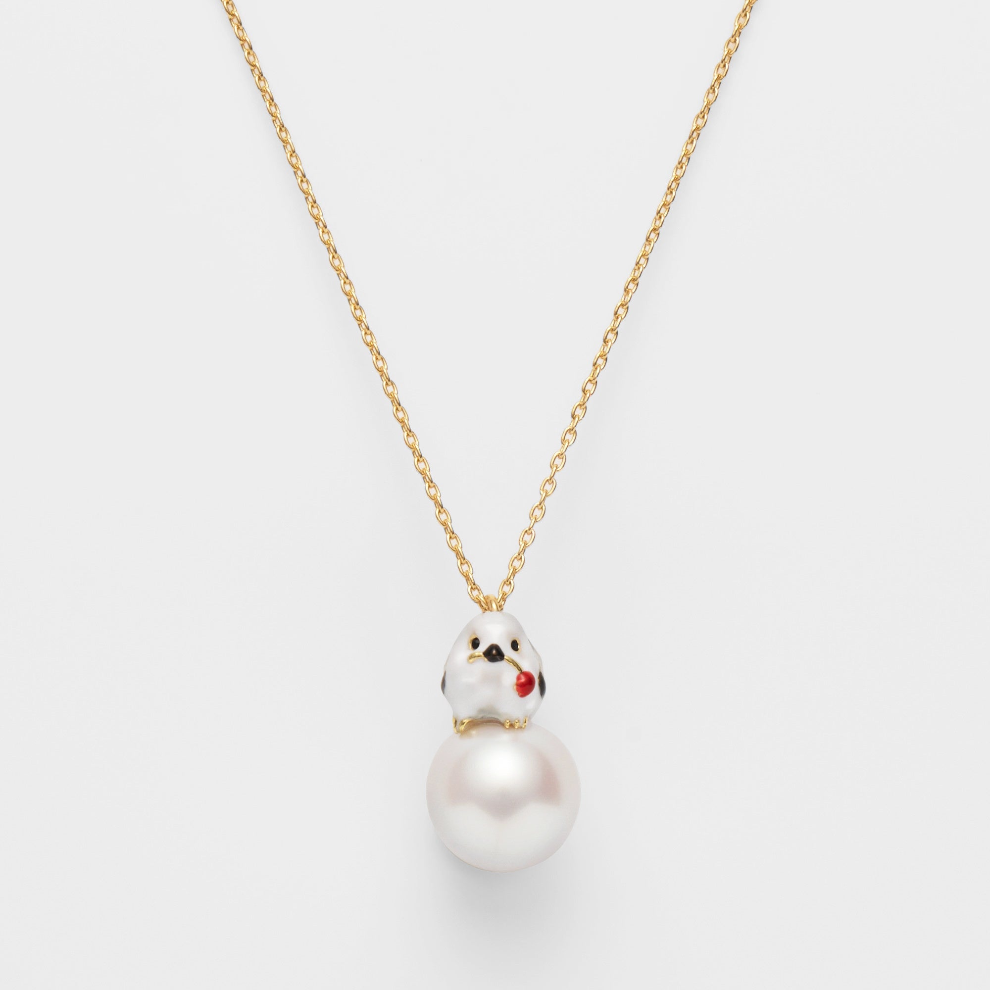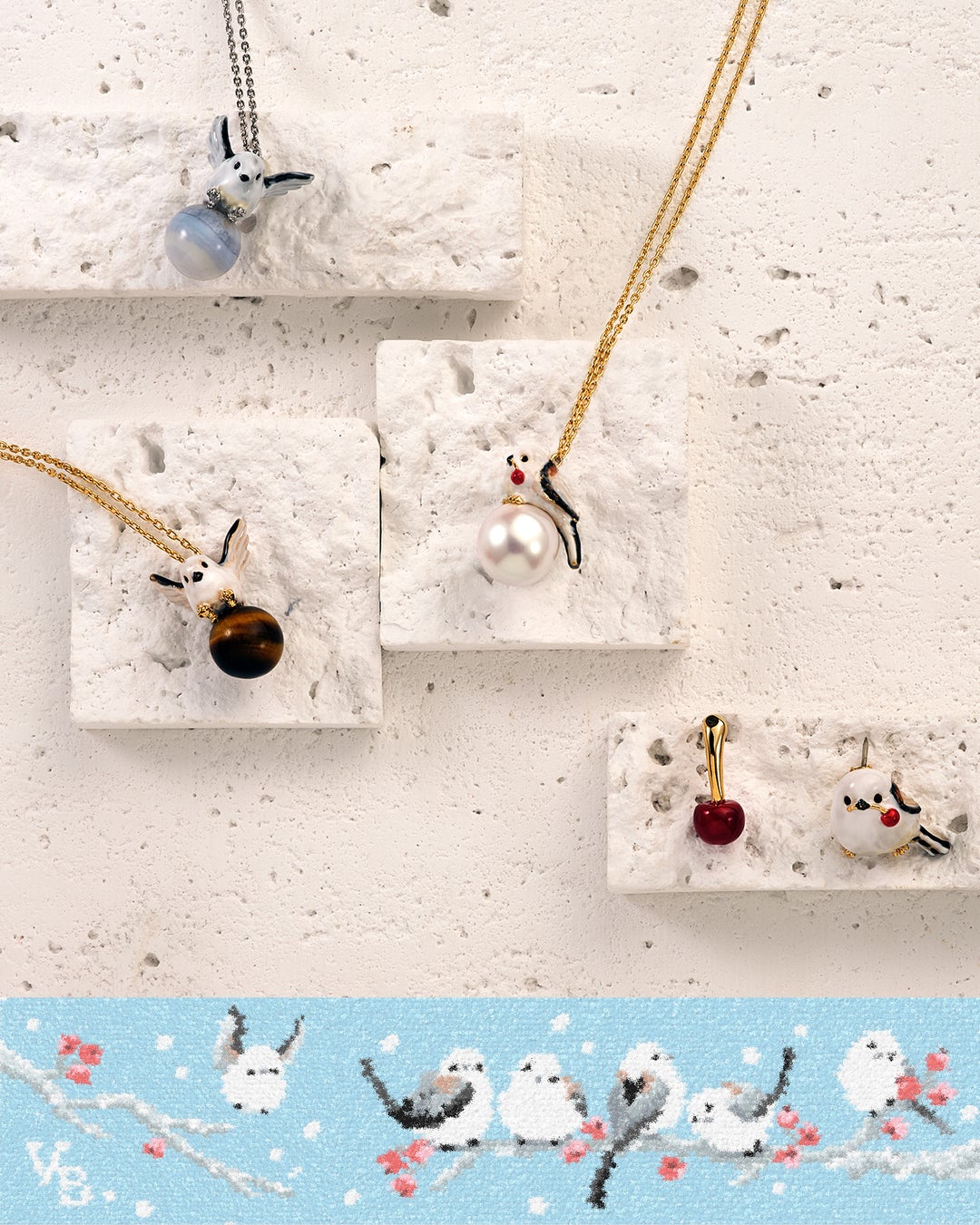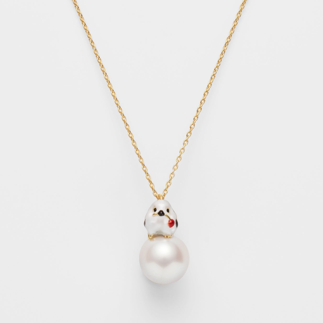 ふわふわの真っ白い羽毛にまん丸シルエットが愛らしいシマエナガのネックレス。赤い実をくわえたシマエナガが、冬の訪れを告げます。雪に見立てたパールは、廃材をアップサイクルした「再生プラスティックパール」を使用しています。