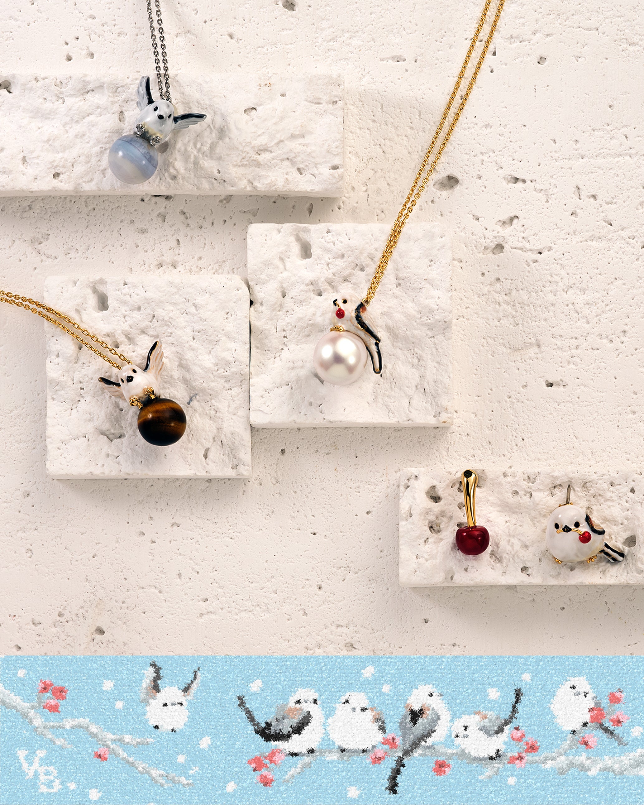 アクセサリーは赤い実をくわえた愛らしい姿や、木の枝から颯爽と飛び立つ姿を表現。冬毛ならではのふっくらとしたシマエナガの羽毛の質感を、熟練した職人が一つ一つ手作業で描きリアルに仕上げました。つぶらな瞳は煌めくカットガラスをあしらい、隅々にまでクラフトマンの技が活かされた繊細なデザインです。