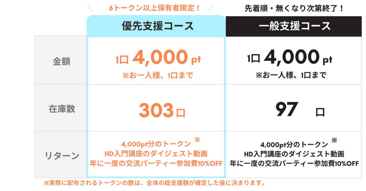 ・全体の400口が完売した時点で一般向けのファンディングは終了となりますが、トークンはその他全てのコースの販売終了後に配布されます。