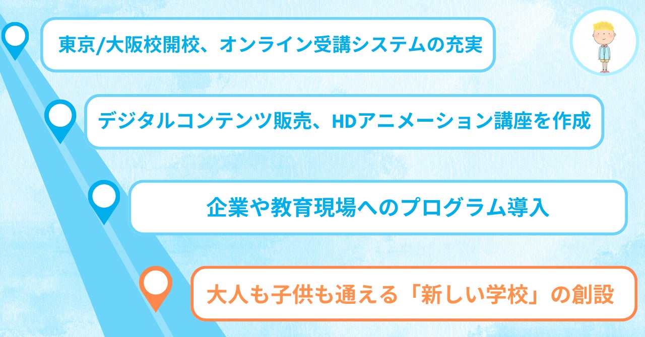 そして、これからの時代を生きる子供たちに向けて、世界初となるHDのアニメーション講座を届けるだけでなく、これまでにない新しい学校を創設します。