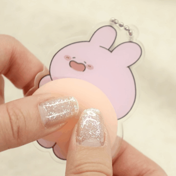 「あさみみちゃん」、「あねみみちゃん」、「ちびみみちゃん」のアクリルキーホルダー。スクイーズ素材のもちもちとしたおしりをリズムに合わせて叩くSNSで人気のシーンが再現できます。