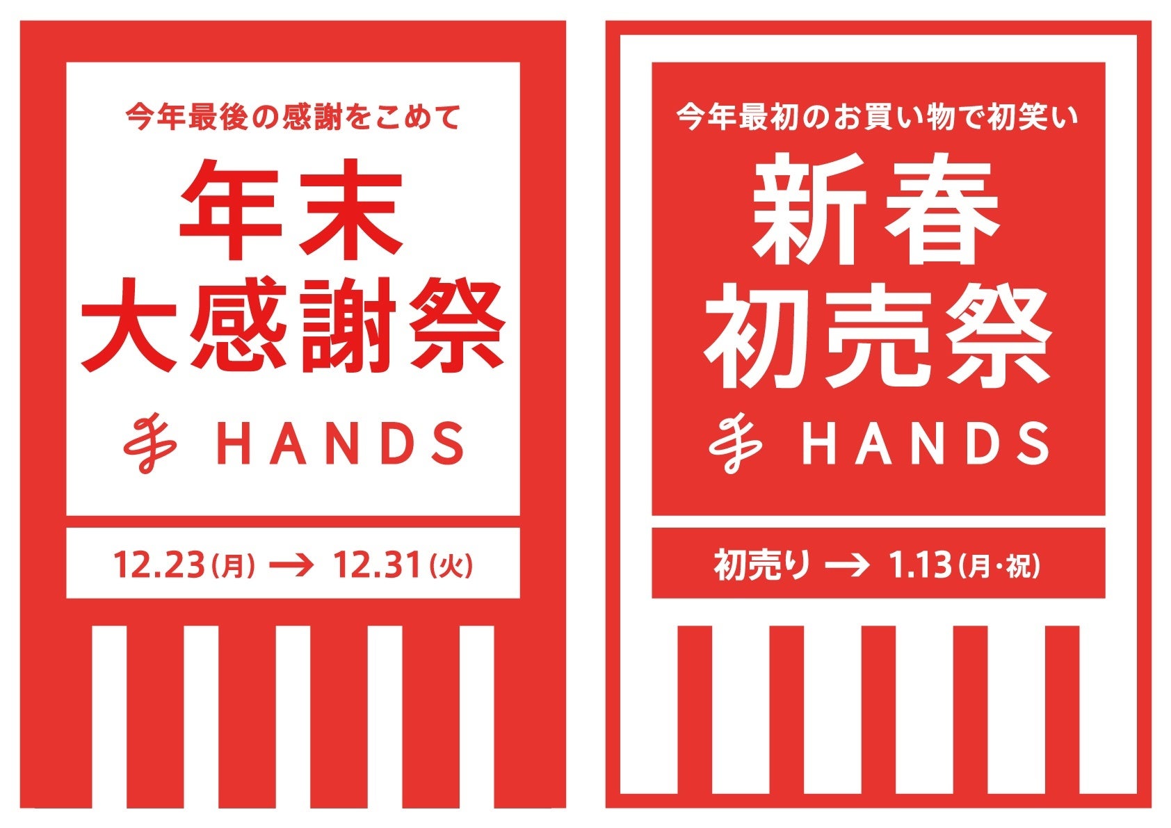 株式会社ハンズ(本社:東京都新宿区)は、今年1年間の感謝の気持ちを込めて12月23日(月)より「年末大感謝祭」を、新年初売り日(※)からは「新春初売祭」を開催いたします。期間中お買い得価格やポイントアップ商品を豊富にご用意しております。一部店舗ではお子様から大人の方までご参加いただけるイベントも開催しますので、年末年始をぜひハンズでお楽しみください!