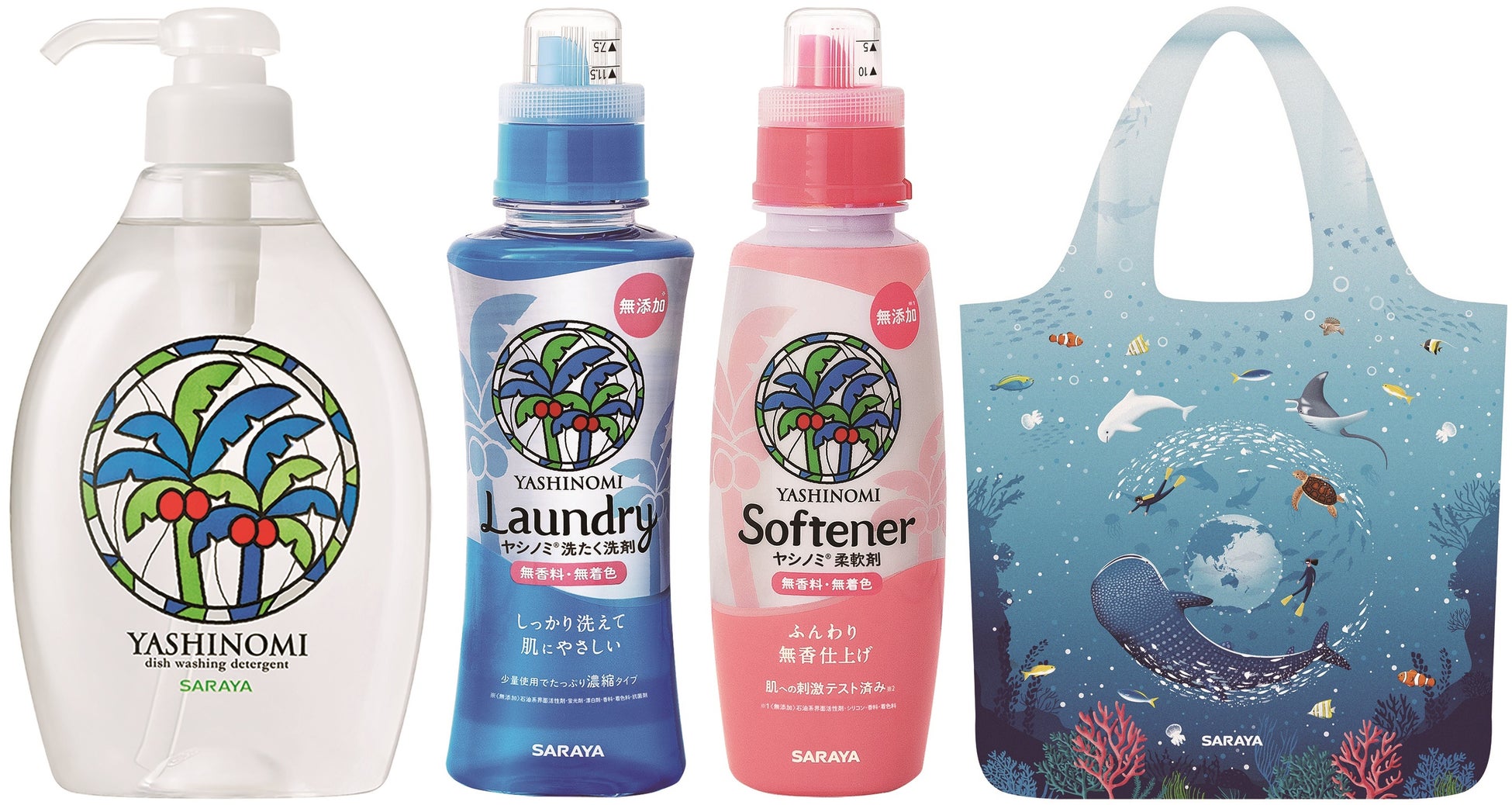 台所用洗剤、洗たく用洗剤、柔軟剤、エコバックのセットです。