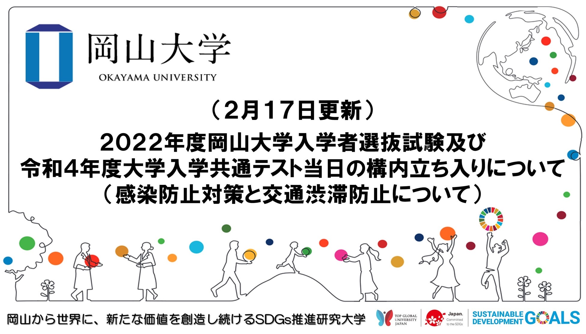 【岡山大学】(2月17日更新)2022年度岡山大学入学者選抜試験及び令和4年度大学入学共通テスト当日の構内立ち入りについて(感染防止対策と交通渋滞防止について)