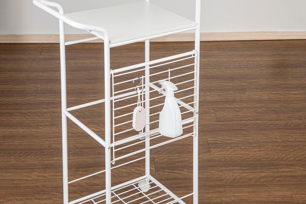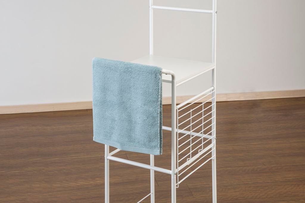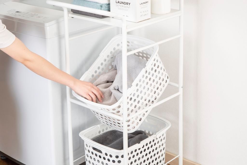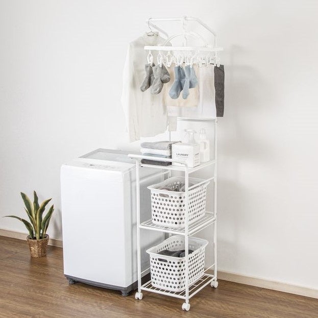 幅37cmとスリムな設計で、場所をとらずに洗濯機から洗濯物を取り出して、そのままハンガーでかけたり、ランドリーバスケットに洗濯物を取り込んでいただけます。ワイヤー棚を取り外せば、バスケットを斜めに置いて取り出しやすくもできます。