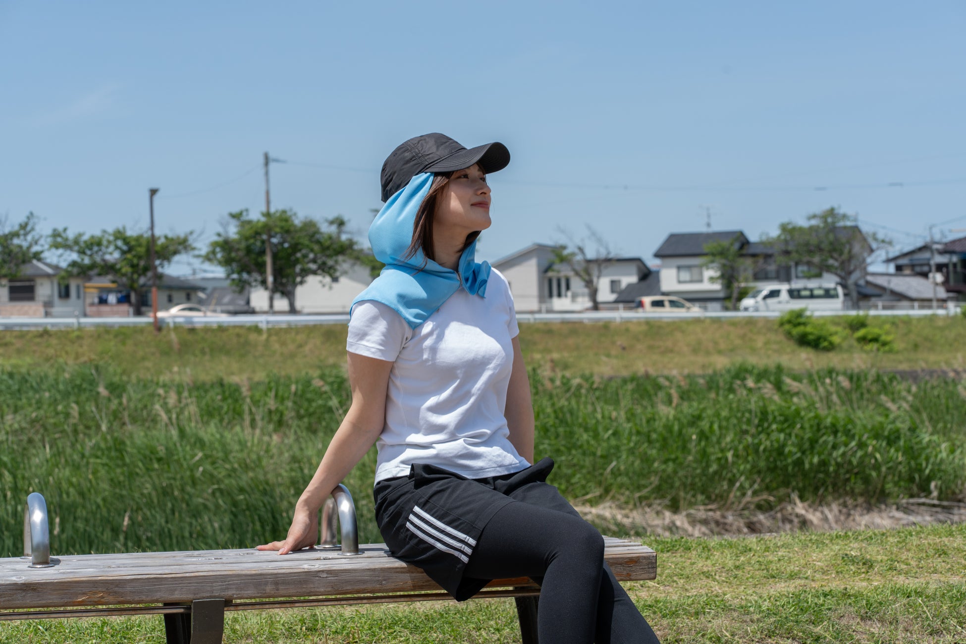 フードにもなるデザインで頭部と首元を覆い、優しいひんやり感を提供します。