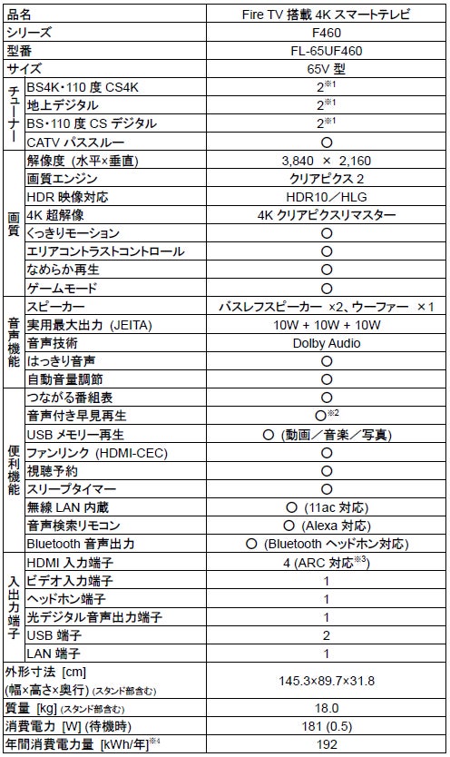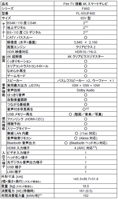 さらに大きな画面でお気に入りのコンテンツを楽しんでいただくため、新たなデザインとウーファーを搭載しF460シリーズとして65V型FireTV搭載スマートテレビをご提供します。画面まわりのフレームを目立たなくすることで画面に集中できるスリムなデザインの65V型は、大画面で迫力のある映像だけでなく、テレビ背面に搭載した大容量ウーファーが力強い低音を実現します。バスレフスピーカーとの相乗効果により、臨場感のある音響をお楽しみください。各種映像機器や録画用ハードディスクを接続するための端子(HDMI端子 4 ポート、USB端子、光デジタル音声出力端子)、LAN端子や、デュアルバンド、デュアルアンテナ、5GHz 対応のWi-Fi 機能を備えています。価格は以下の通りです*4 。
