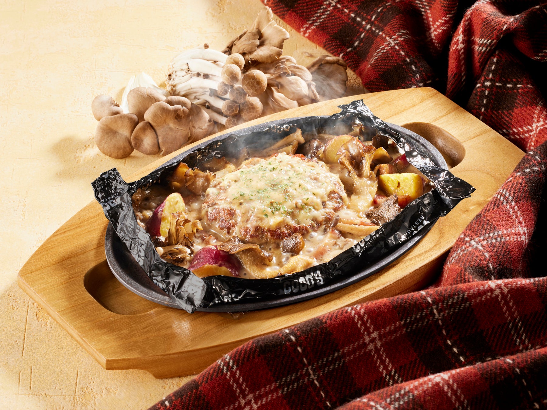 ココス自慢の“包み焼きハンバーグ”に、素揚げすることで旨みをぎゅっと凝縮させた3種のきのこ(しめじ・舞茸・平茸)と、マッシュルームの香り豊かなクリームソースを組み合わせました。風味豊かなきのこと、とろ~りとろけるステッペンチーズは相性抜群。ほくほくのサツマイモの甘みとベーコンの程よい塩味が、きのこやハンバーグの旨みを引き立てます。