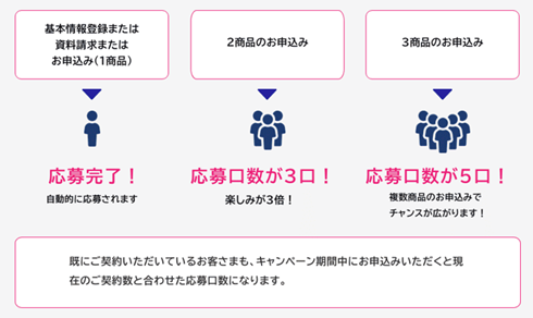 本キャンペーン期間中、インターネットで、「資料請求のお申込みをいただいた方」、「お見積り後に基本情報をご登録いただいた方」、「保険商品をお申込みいただいた方」の中から抽選で13名様に、豪華宿泊ギフトや国産和牛ギフト等をプレゼントいたします。2つ以上の保険商品をお申込みいただいた方は、抽選キャンペーンの当選確率がアップします。(例:1つの保険商品のお申込みで応募口数が1口、2つの保険商品のお申込みで応募口数が3口、3つの保険商品のお申込みで応募口数が5口)。