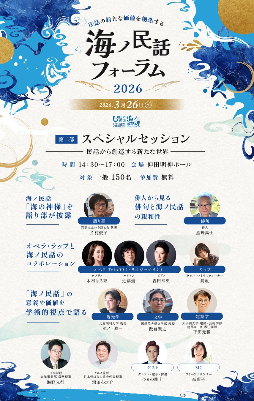 一般社団法人日本昔ばなし協会が推進する「海ノ民話のまちプロジェクト」の集大成となるイベント『海ノ民話フォーラム2026』を、2026年3月26日(木)に東京・神田明神ホールにて開催いたします。