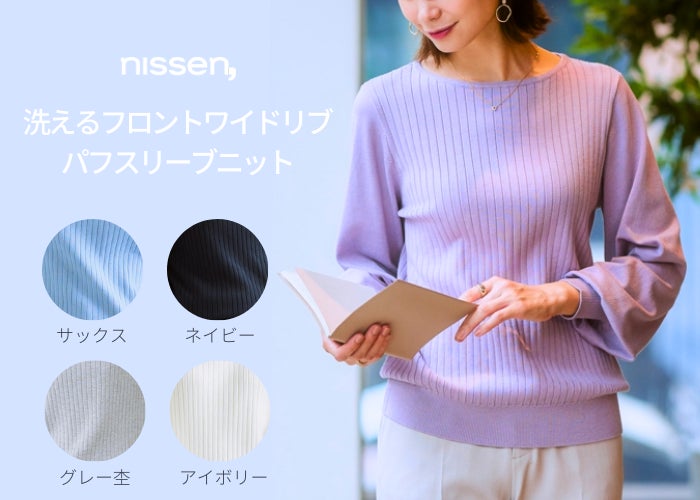 商品名:洗えるフロントワイドリブパフスリーブニット
