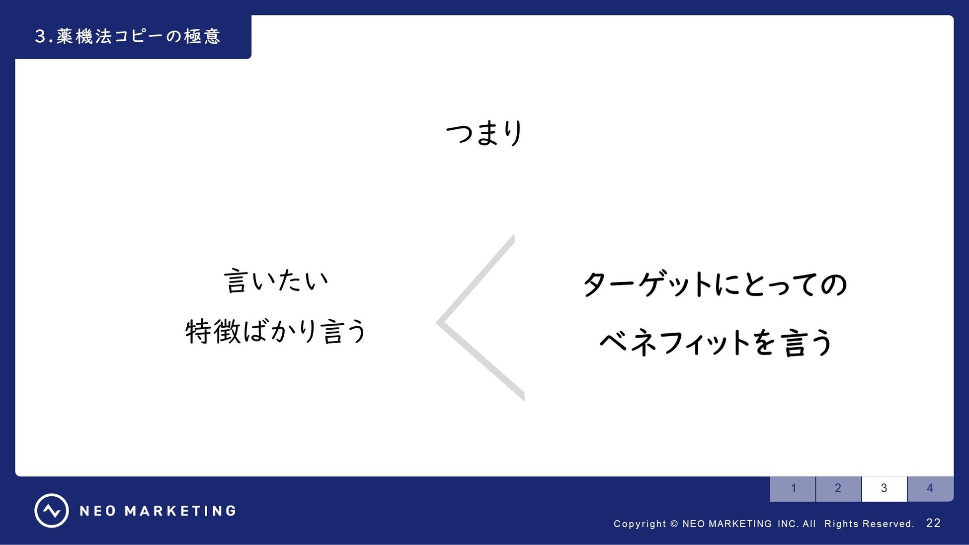 株式会社ネオマーケティング(本社:東京都渋谷区、代表取締役:橋本光伸)は、「訴求力を落とさない!現役コピーライターが語る、法的制約を乗り越える薬機法リライト術」のホワイトペーパー(31ページ)を無料で公開いたしました。