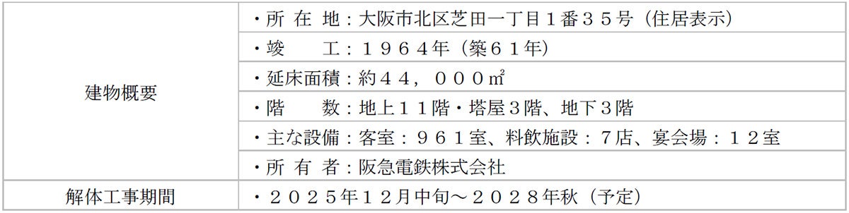 旧大阪新阪急ホテルは、1964年8月8日の開業以来約60年間にわたり多くのお客様にご愛顧いただき、2025年1月4日のご宿泊利用をもって営業を終了しましたが、阪急電鉄株式会社および阪急阪神不動産株式会社は、2025年12月中旬から同建物の解体工事に着手することとなりましたので、お知らせします。