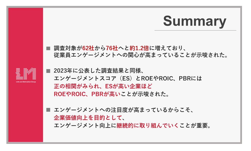 株式会社リンクアンドモチベーション(本社:東京都中央区、代表:小笹芳央、証券コード:2170、以下当社)の研究機関であるモチベーションエンジニアリング研究所は、「従業員エンゲージメントと投資指標の関係性」に関する調査(2023年データ分析)を行いましたので、結果を報告いたします。