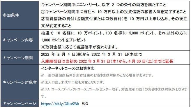 また、お客さまからのご要望にお応えし、2022年2月4日(金)から実施中の「ハズレなし!当社への投信お乗り換えが超おトクキャンペーン」の移管入庫の締切日を2022年4月30日(土)まで延長します。