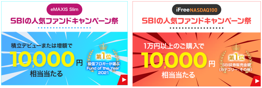 本キャンペーンは、「eMAXIS Slimで積立デビュー!増額も!1万円相当があたるキャンペーン」と「iFree NASDAQ100でパワーアップ!1万円相当があたるキャンペーン」の2つキャンペーンから構成されます。