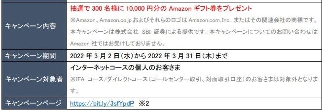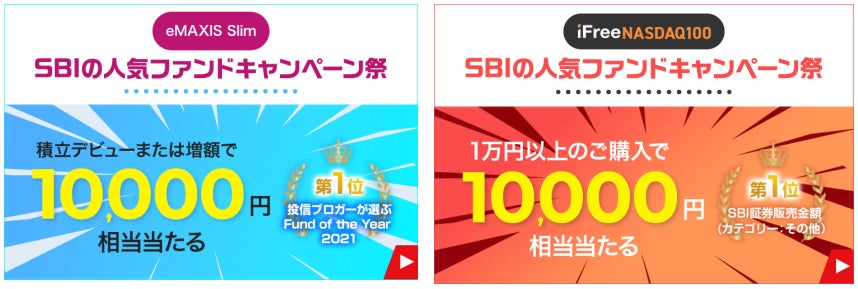 株式会社SBI証券(本社:東京都港区、代表取締役社長:髙村正人、以下「当社」)は、2022年3月2日(水)から「SBIの人気ファンドキャンペーン祭」を実施します。本キャンペーンでは、投資家の方々から人気のある「eMAXIS Slimシリーズ」や「iFreeレバレッジ NASDAQ100」などを対象に、条件を満たしたお客さまの中から抽選で、10,000円相当のポイントまたはAmazonギフト券をプレゼントします。