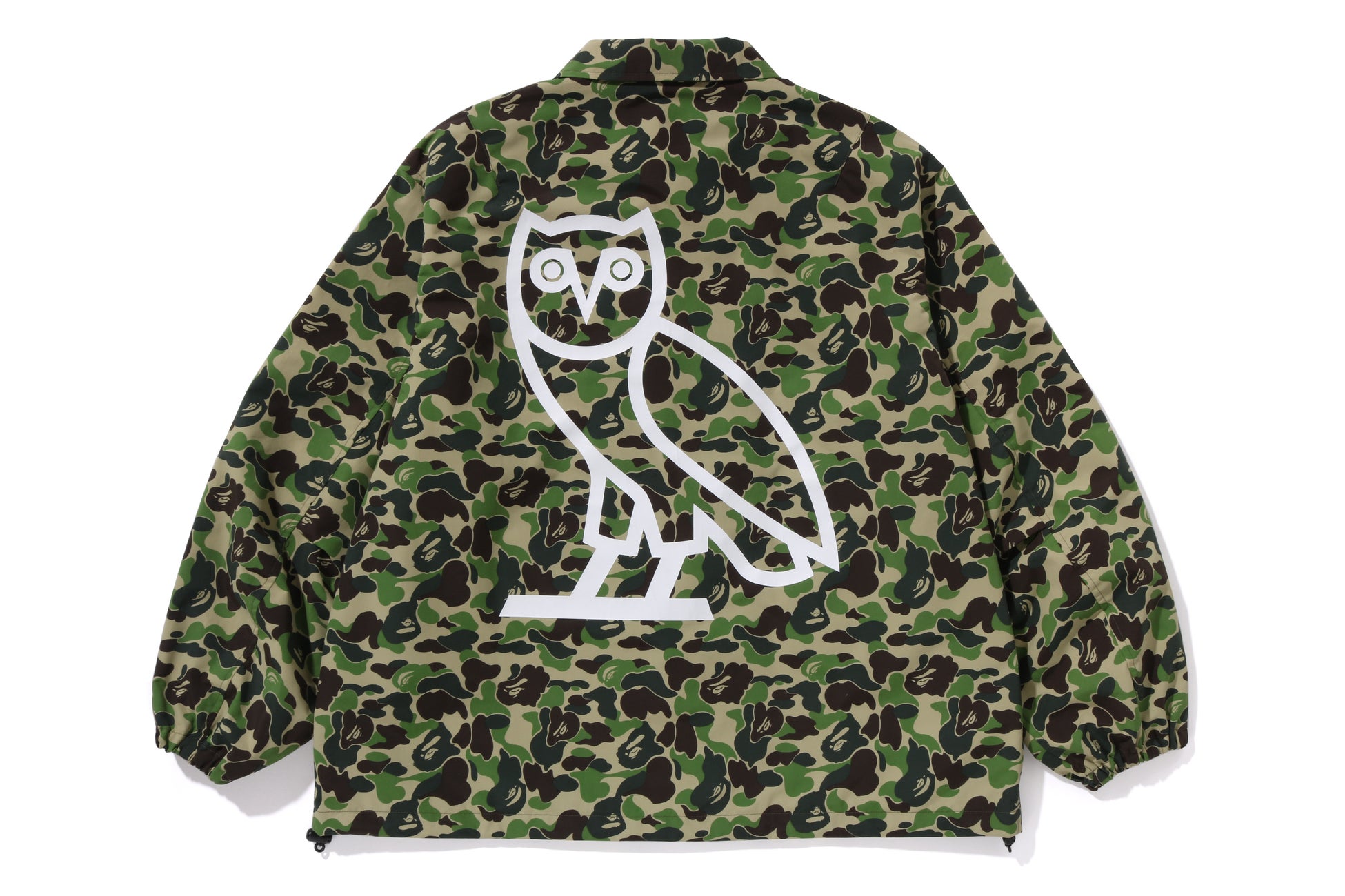 4度目となる今回のコラボレーションは、APE HEADと「OVO」のキャラクター、OWLを重ねたコラボレーション限定のロゴに加え、BAPE CAMO柄やジェネラルモチーフといったBAPE®︎のアーカイブをサンプリング。コーチジャケット、フーディ、カーゴパンツ、Tシャツ、トラッカーキャップがラインアップします。