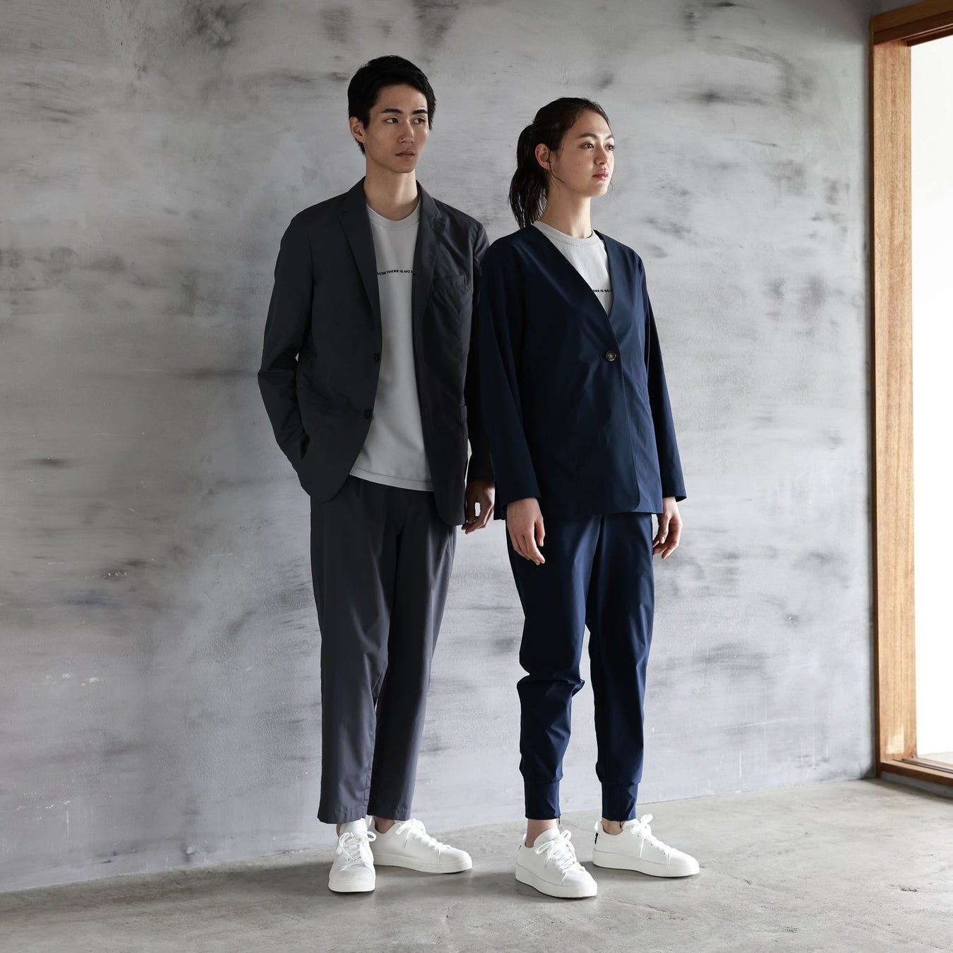 ⑤「ACT ノーカラーストレッチジャケット」、⑥「ACT ストレッチパンツ」 ※写真右(女性着用分)