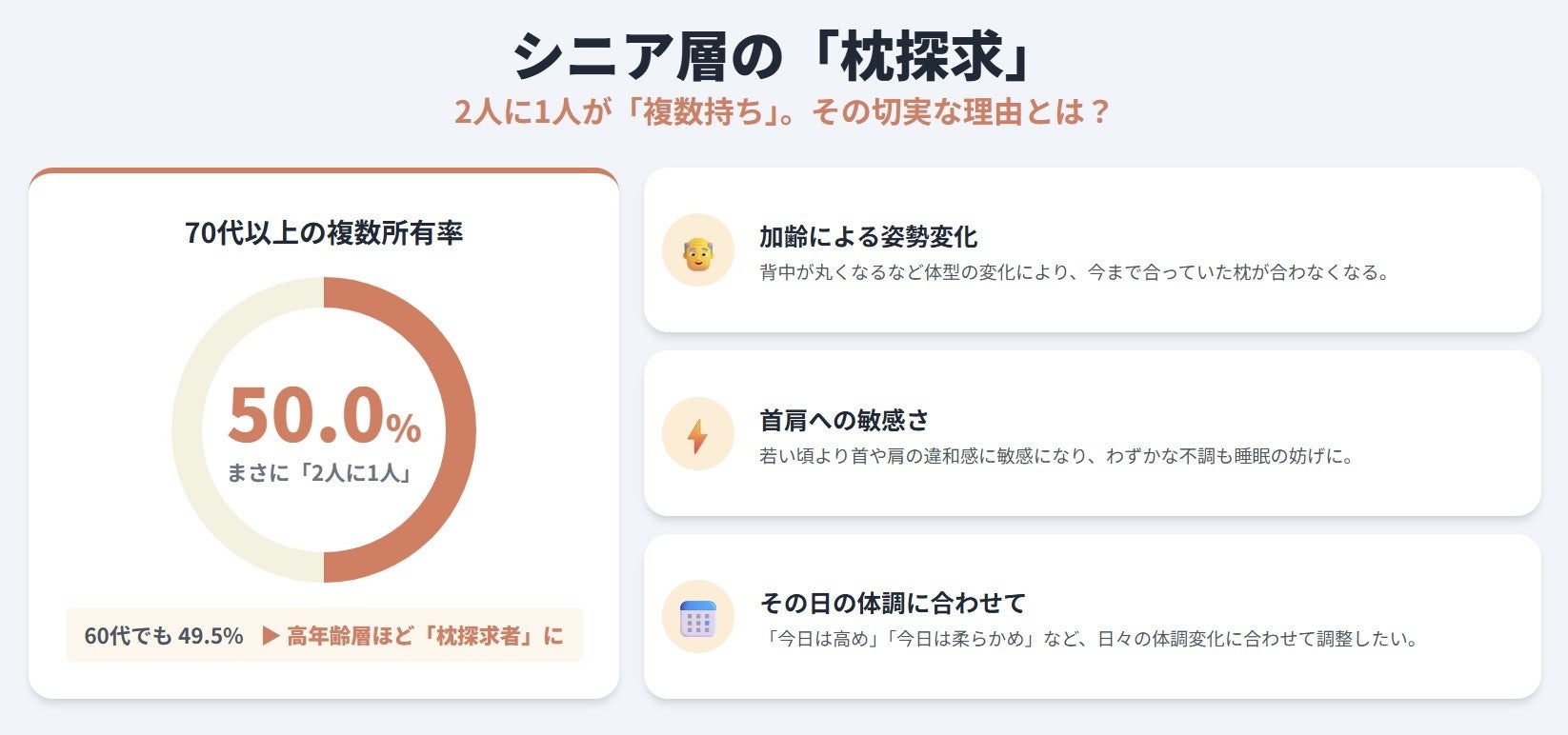 背景には、「加齢による姿勢変化」「首肩の違和感への敏感さ」「その日の体調に合わせたいというニーズ」があるとみられ、より良い1個を探し続ける探求心が複数所有を後押ししていることが考えられます。