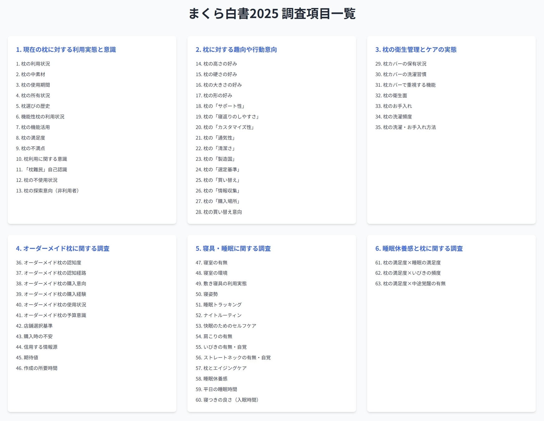 データがくれる「気づき」と「確かなヒント」。睡眠課題を「自分ごと」にし、健やかな毎日へ。枕や睡眠に関する調査アンケート63件を収録。