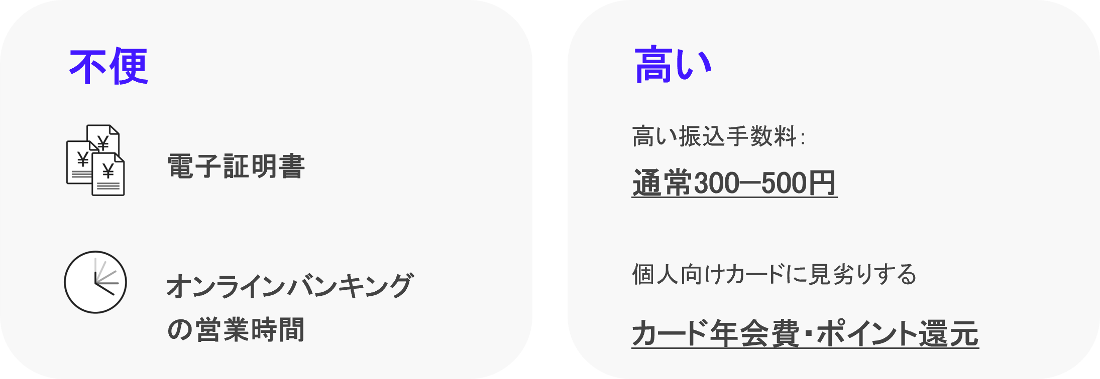 従来の法人向け金融機関は、サービスや手続きにおいてデジタル化や効率化が遅れており、これが多忙な中小企業経営者の時間とコストを圧迫しています。 特に、複雑な手続きや時間の制約、高止まりしたままの振込手数料やカード年会費などのコスト構造が、中小企業の財務体質や事業成長の足かせとなっています。