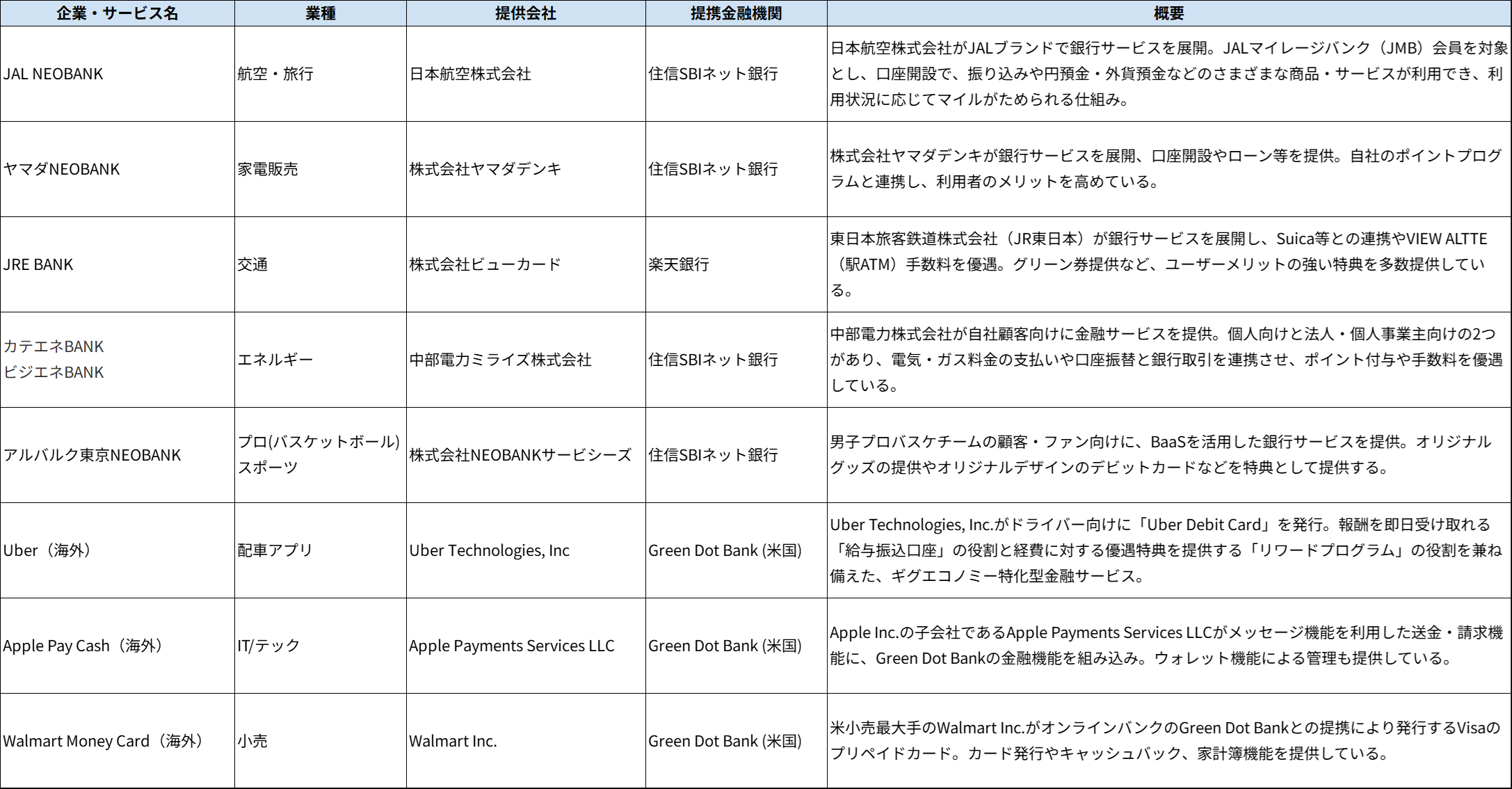 近年、BaaSを活用した非金融事業者による決済サービスの提供が、アパレル・小売、モビリティ、通信、ITなど幅広い業界で増加しています。事業者は、口座、決済、融資、送金といった金融機能を、自社サービスの中に直接統合できる点が大きな特徴です。以下に航空・旅行、小売、モビリティ、プロスポーツ、ITなど多岐にわたる業界における代表的な事例を取り上げました。表には、各社が提携する金融機関とともに、どのようなサービスを構築しているかを整理しています。