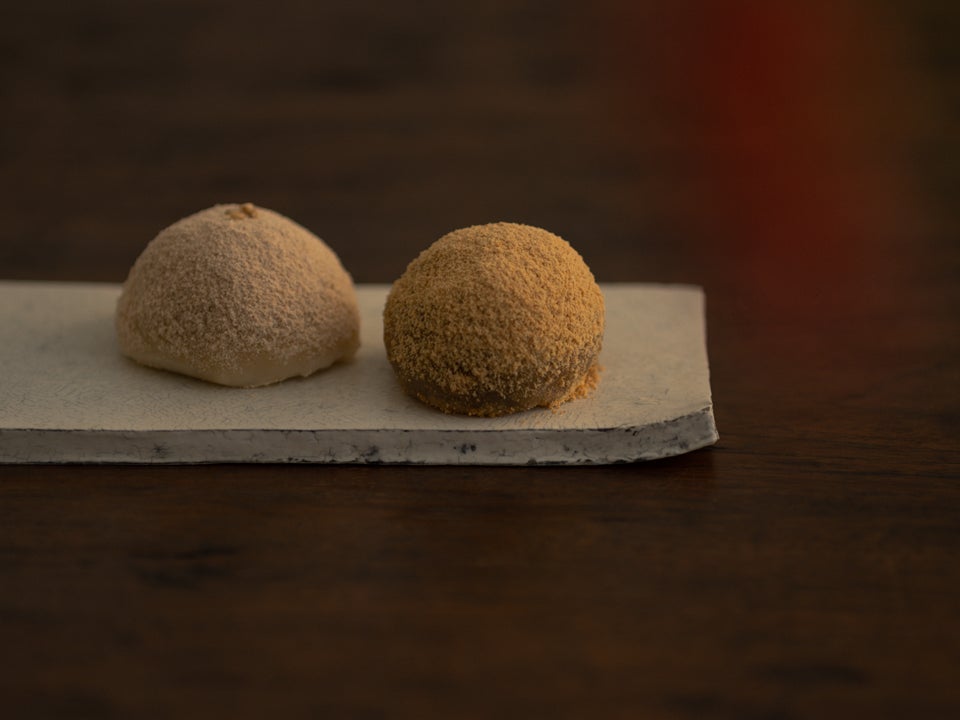 ふわふわと雲を食むような食感が魅力の、24時間という限りある時間に命を宿した繊細な菓子。栗の水もちはカルダモンの香りを移した白餡を合わせ、和薔薇の水もちは蓮根の澱粉を用い、りんごの花の蜂蜜を加え透明感のある味わいに。