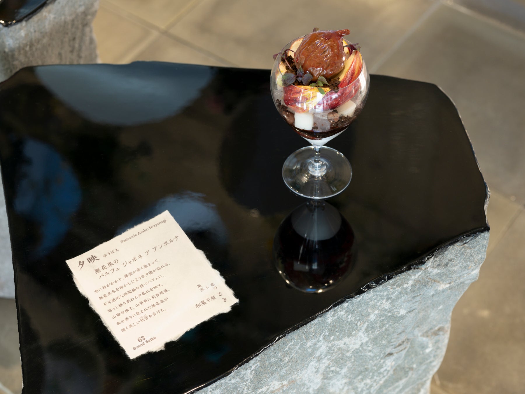 空に紗がかかり、次第に薄雲が赤く染まって、無花果色を溶かしたような夕闇が訪れる。不可逆的な時間軸を持つパフェという菓子に、刻々と移り変わる秋の夕暮れを映す。思えば無花果自身がグラデーションを持ち、秋の夕暮れを秘めているようだ。山椒や柚子、山葡萄に花香焙茶(はなかほうじちゃ)……。和の香りに包まれた無花果が深く美しい秋宵(しゅうしょう)を告げる。